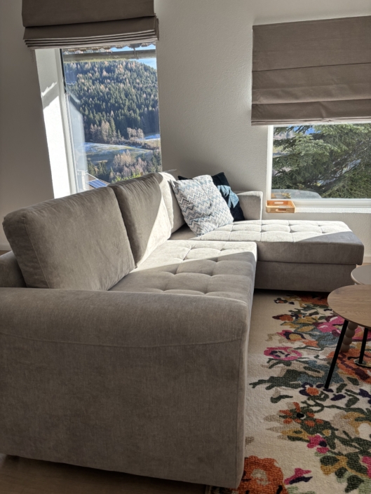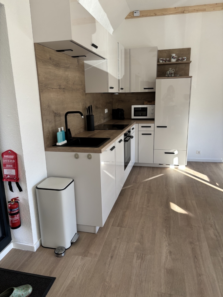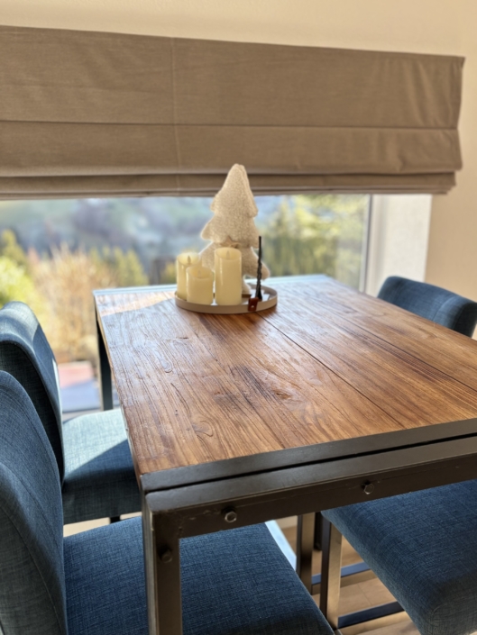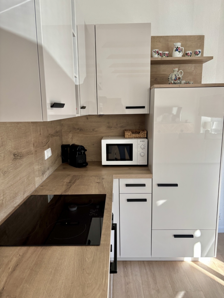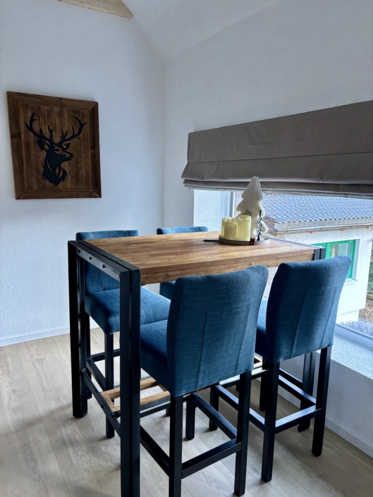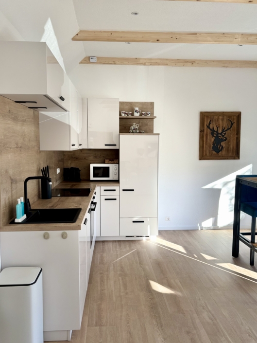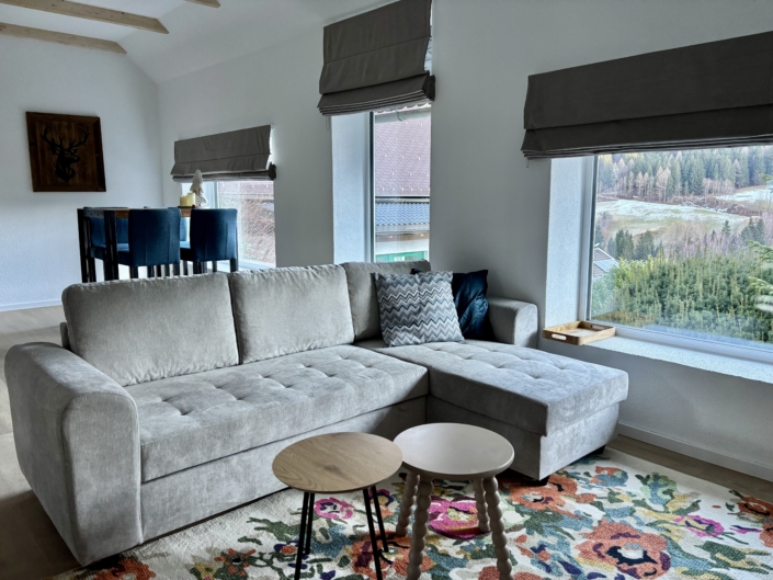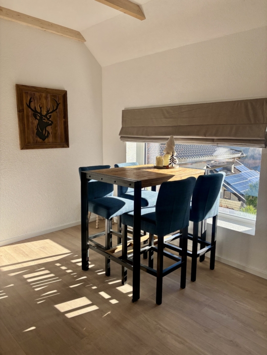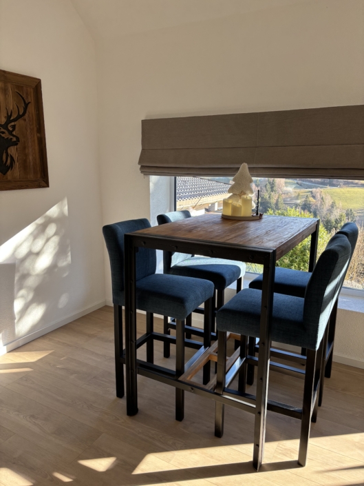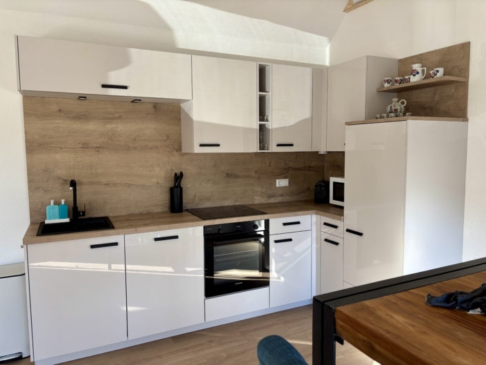 Er is dus direct contact tussen degene die staat te koken en de mensen aan tafel. Keuken heeft verder alle voorzieningen die je kunt wensen. Om er een paar te noemen: vaatwasser, 4 kookzones inductieplaat, koffiemachine (Nespresso), waterkoker, meer dan genoeg echt Oostenrijks serviesgoed en uiteraard een koelkast met vriezer.