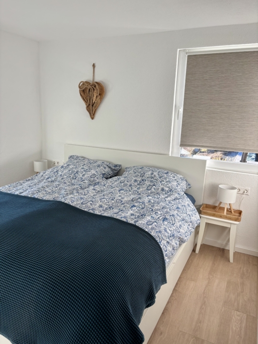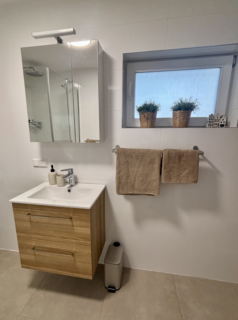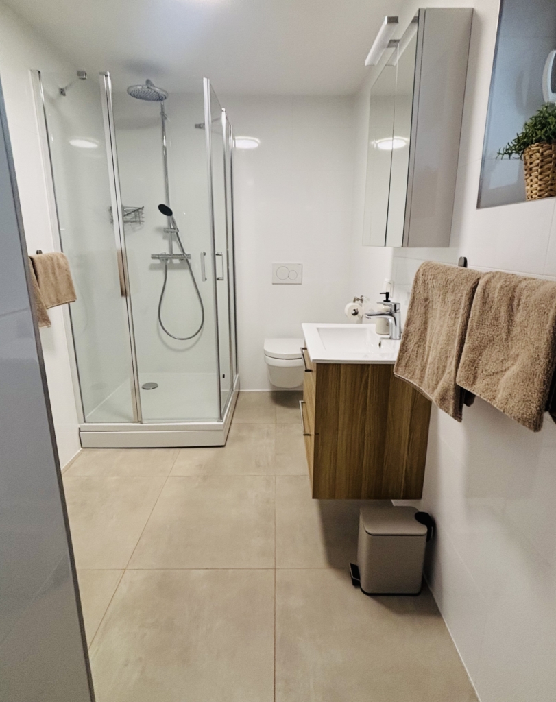 Direct naast de slaapkamer is de ruime badkamer met douche, toilet en wastafel.