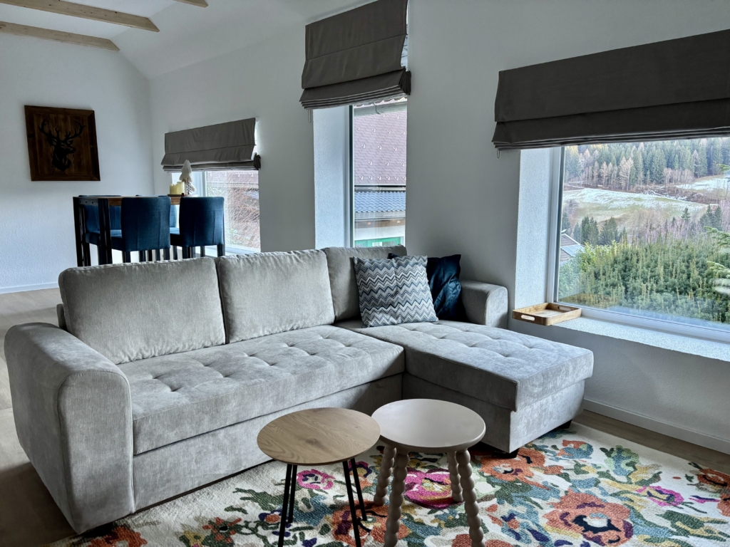 Een heerlijke (slaap) bank, eettafel met 4 stoelen om aan te eten, met direct uitzicht op de bergen. Een kinderstoeltje is ook aanwezig . Kinderboeken en leesboeken voor volwassenen liggen in de boekenkast. Ook spelletjes ontbreken hier niet voor veel gezellige momenten met elkaar.