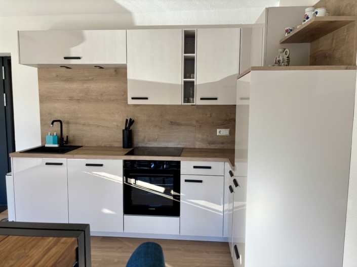 This means there is direct contact between the person cooking and those at the table. The kitchen is fully equipped with everything you could wish for. To name a few: dishwasher, 4-zone induction cooktop, coffee machine (Nespresso), kettle, plenty of authentic Austrian tableware, and of course a fridge with freezer.